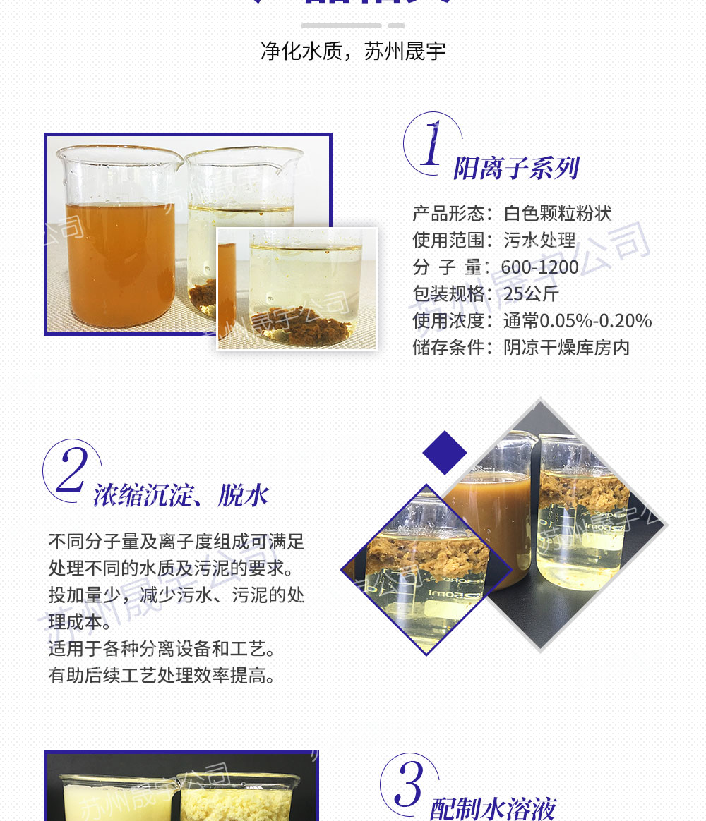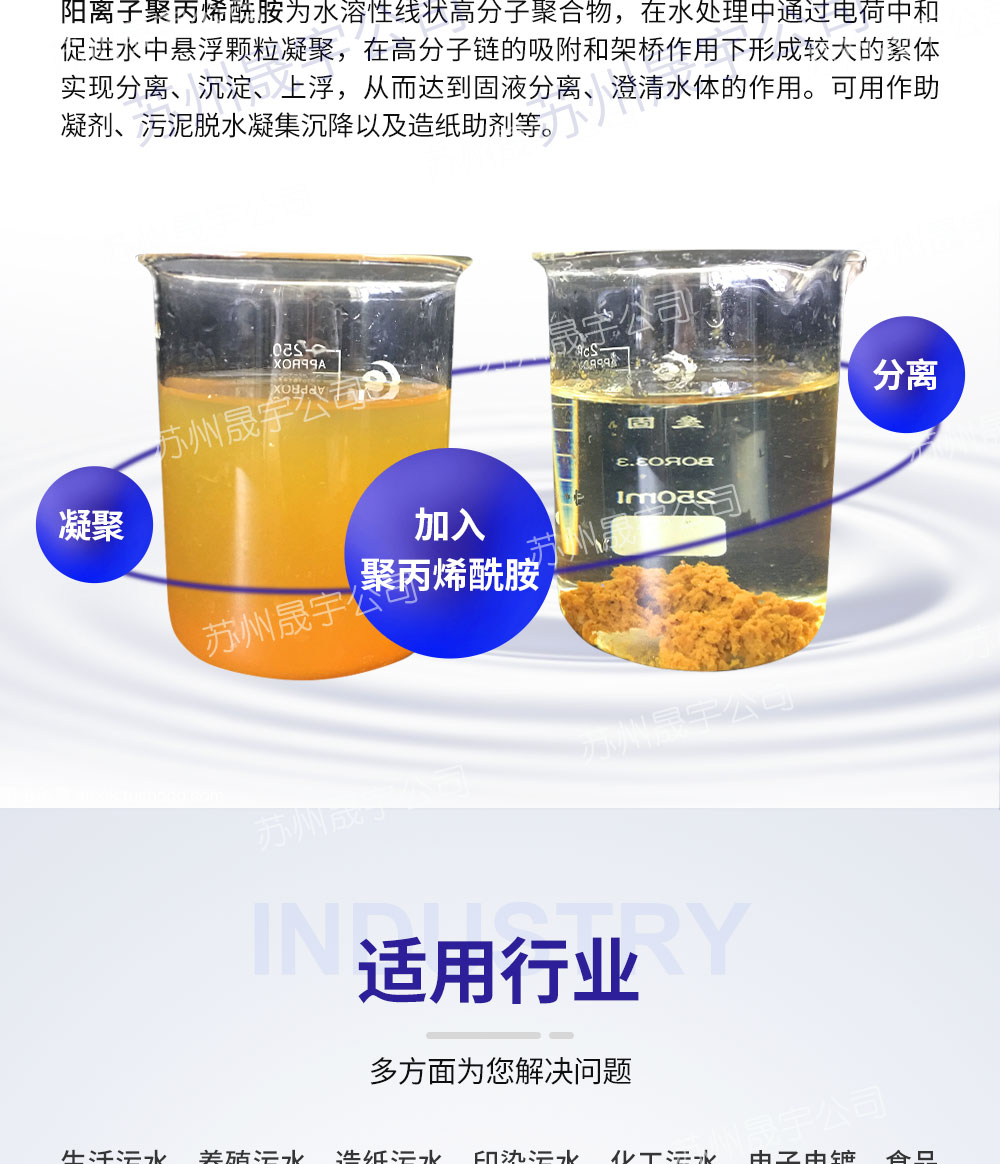 阳离子聚丙烯酰胺分子量为600万-1200万,离子度10-70,在工业污水处理中可用于絮凝、气浮、污泥脱水等。阳离子聚丙烯酰胺投加量少,可减少污水、污泥的处理成本,适用于各种分离设备和工艺。