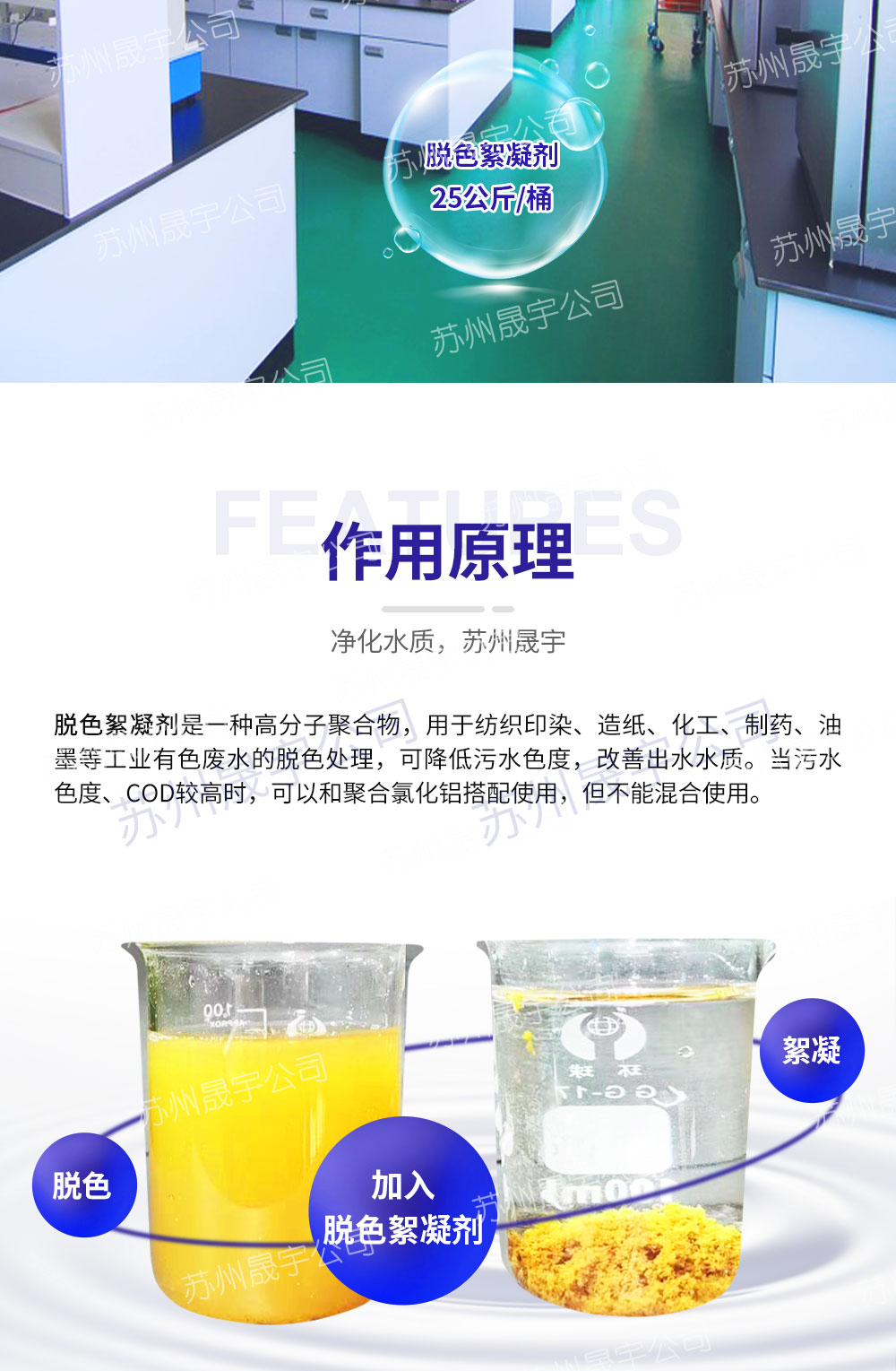 脱色絮凝剂是一种高分子聚合物,用于纺织印染、造纸、化工、制药、油墨等工业有色废水的脱色处理,可降低污水色度,改善出水水质。当污水色度、COD较高时,可以和聚合氯化铝搭配使用,但不能混合使用。