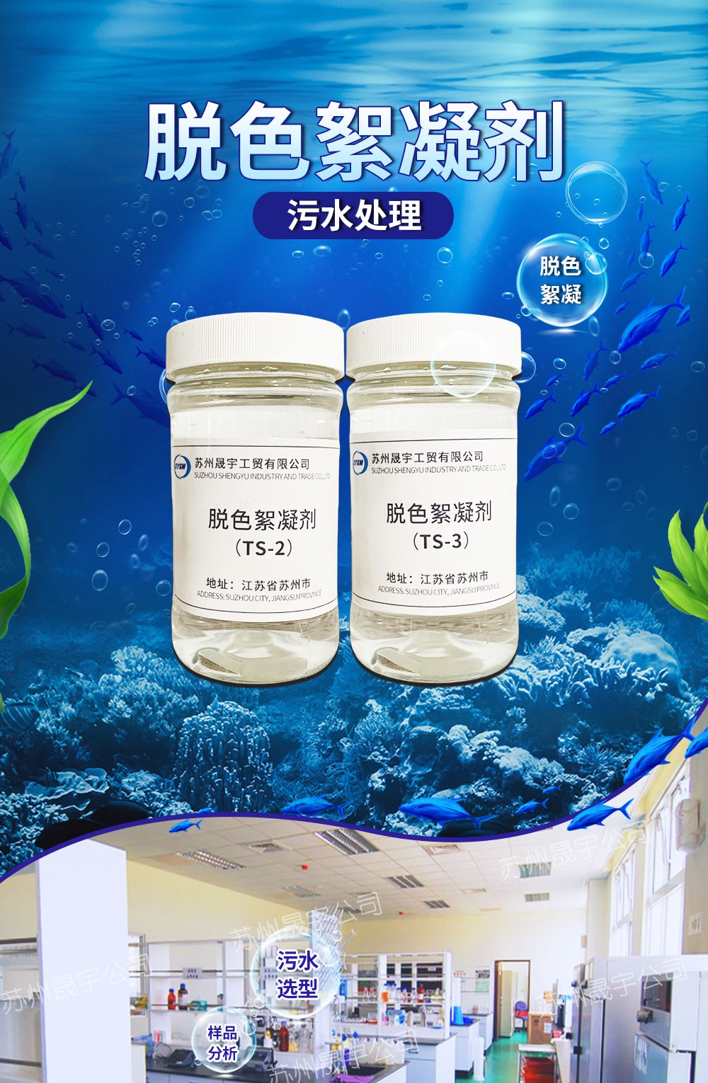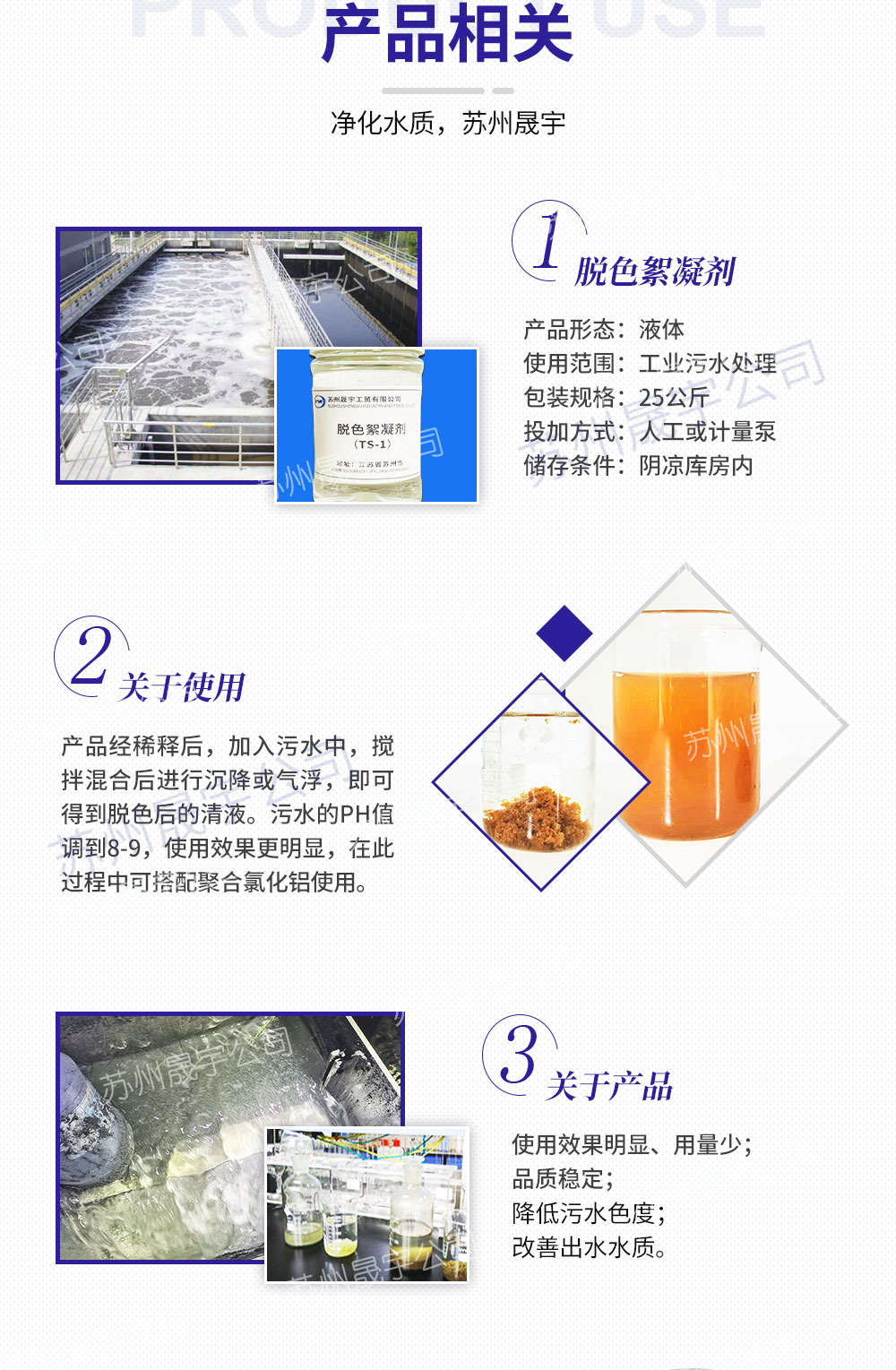 脱色絮凝剂TS-2产品形态:液体,使用范围:工业污水处理,包装规格:25公斤,投加方式:人工或计量泵,储存条件:阴凉库房内。脱色絮凝剂TS-2使用效果明显、用量少,品质稳定,降低污水色度,改善出水水质。