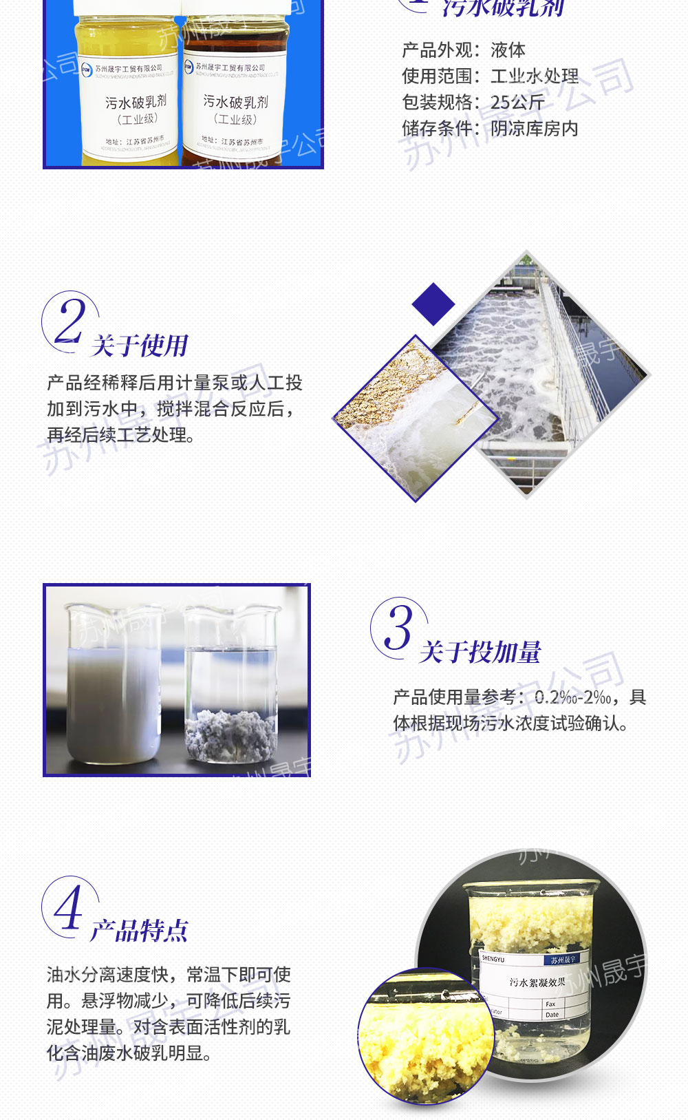 油脂破乳剂主要通过吸附和电荷中和作用,使水中细微悬浮粒子和胶体离子脱稳、聚集、混凝、沉淀,达到破乳分离效果。处理污水时,先加油脂破乳剂分离浮油,然后将油水分离,在水中再加聚丙烯酰胺絮凝剂进行絮凝沉淀。